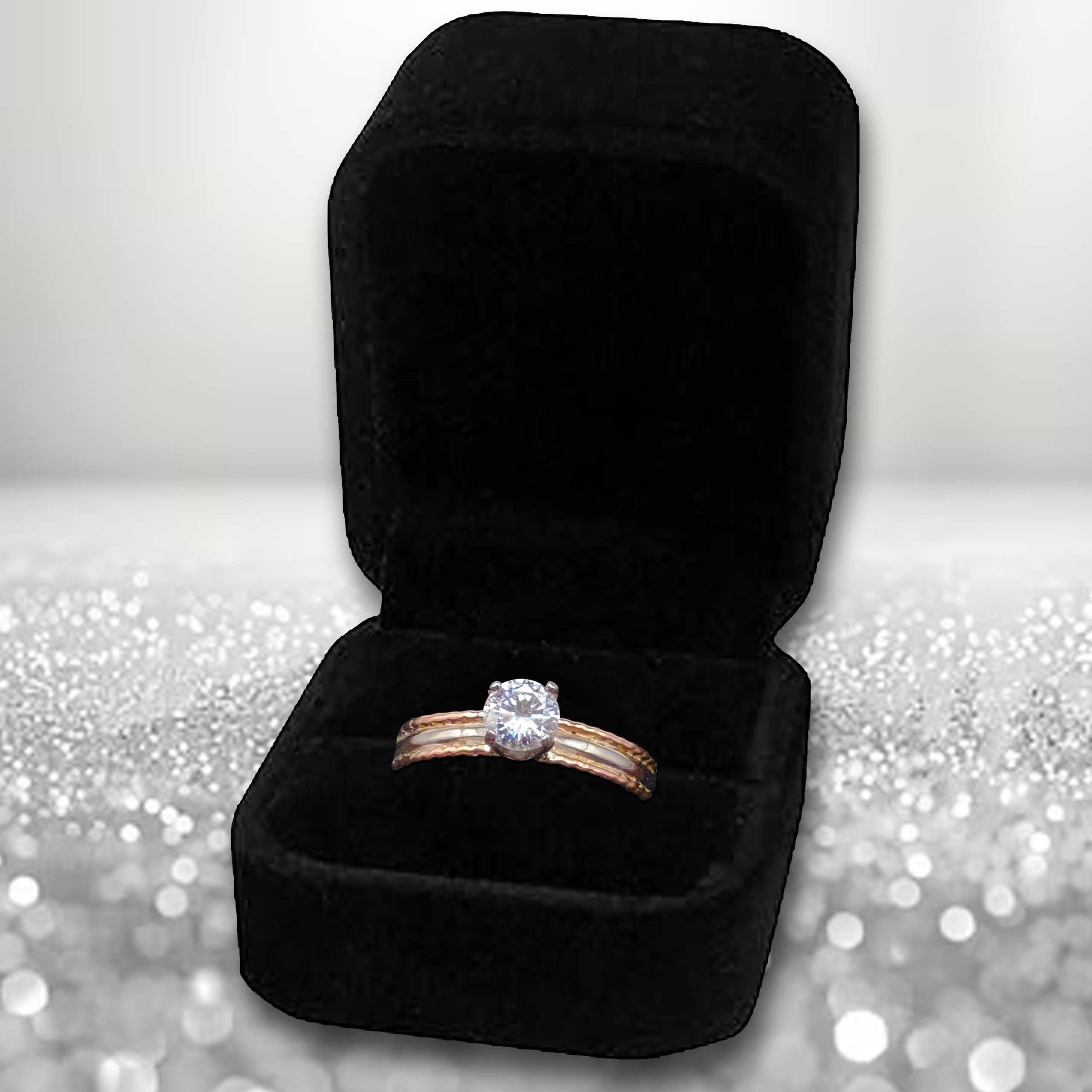 A 5mm round brilliant-cut Forever One Moissanite, set in a rhodium-plated 14k white gold band with a 14k rose gold rope trim. A timeless fusion of fire, elegance, and lasting brilliance.